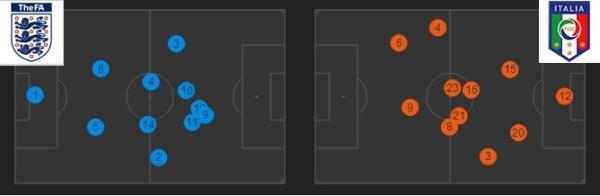 Ранее мы указывали, что больше всего голов забиваются из пределов штрафной, а стало быть, эффективность владения можно оценить по доставкам мяча в штрафную площадь соперника. За весь матч Италия нанесла 5 ударов из штрафной, а Англия – 4. На первый взгляд разница небольшая. Но если посмотреть на количество острых передач (пас партнеру в голевое положение), то счет будет 12-6 в пользу команды Пранделли. Из-за сложности исполнения, процент точности подобных передач редко когда превышает 50 %, и в этом плане матч Англия – Италия не стал исключением. На счету итальянцев 4 точные острые передачи, а у англичан 2. Таким образом, команда Пранделли чаще обостряла игру, и извлекла больше пользы из своего владения. Теперь давайте разбираться, каким образом она это делала.