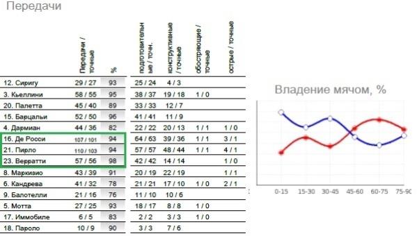 Неудивительно, что Де Росси, Верратти и Пирло выполнили больше всего передач в матче. Добавим сюда передачи Мотты, который заменил Верратти во втором тайме, и получим общую сумму передач для центральных полузащитников – 301 (46% от общего количества всей команды). На графике справа (синяя кривая) видно, что в первой половине итальянцы чаще владели мячом (65%), что значительно больше среднего значения за матч (56%). Это важно отметить, так как ключевые события в игре приходятся на отрезок до 50 минуты, когда счет стал 2:1 в пользу Италии.
