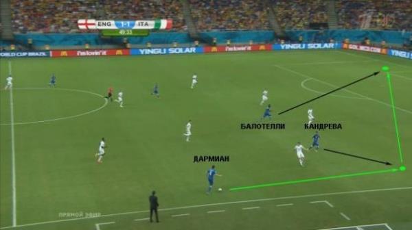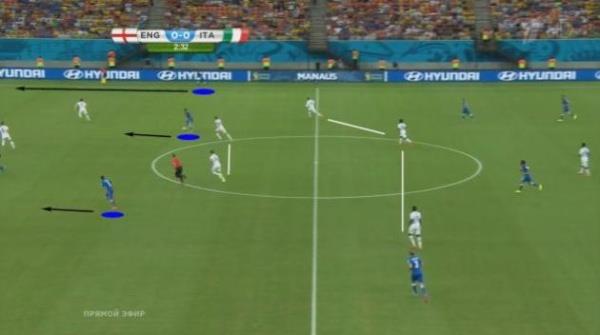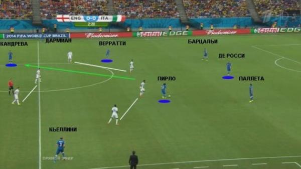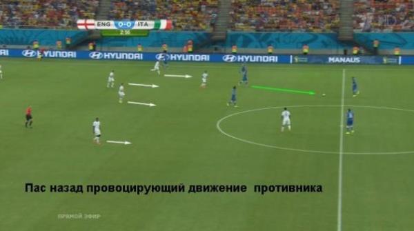 Выше показано исходное положение сборной Италии во время подготовки атаки. Крайние защитники Кьеллини и Дармиан, занимая широкие позиции, обеспечивают ширину атаки. Де Росси опускается в линию обороны, а Пирло с Верратти располагаются чуть выше. Обратите внимание на позицию Кандревы. Он заранее распылается на линии возможной передачи, которая проходит в условном коридоре между игроками сборной Англии. Спустя мгновение Пирло сделает два шага в сторону и выполнит нацеленную проникающую передачу за спину сразу пятерым (!) игрокам соперника.
