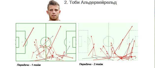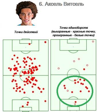 Вышеприведенные схемы передач Витселя указывают на то, что, по всей видимости, в перерыве Вильмотс скорректировал его задачи на футбольном поле. Если в первой половине матча он преимущественно выполнял передачи на чужой половине поля, то во второй – больше уделял вниманию подготовке атаки, на что указывают пунктирные стрелки обозначающие подготовительные передачи (пас ближайшему партнеру, не развивающий атаку. Цель подготовительной передачи – только контроль мяча). Также поражает статистика выигранных единоборств Акселя.