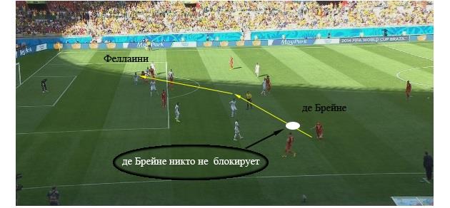 Противник предоставил Кевину слишком много пространства и времени для выполнения нацеленной передачи на Феллаини. Включая матчи квалификации, это 19-й гол бельгийской сборной, из которых в девяти случаях де Брейне принимал непосредственное участие во взятии ворот соперника (4 гола и 5 результативных передач). Спустя еще десять минут, отобрав мяч в подкате на своей половине поля, де Брейне начнет результативную контратаку своей команды (самое грозное оружие Бельгии, на наш взгляд).