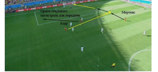 На 58-й минуте Вильмотс заменил выпавшего из игры Лукаку. В центр нападения отправляется Ориги, а на 66-й минуте вместо Дембеле выходит Феллаини. Выходит не в центр полузащиты, а в линию атаки. Надежная игра Витселя в центре полузащиты позволяла пойти на такой шаг. На схемах усредненных позиций также видно, что Феллаини (№8) действовал практически в одной зоне рядом с Ориги (№17) и Мертенсом (№14). Вильмотс определенно бил в одну точку.