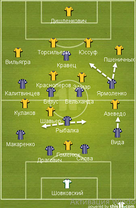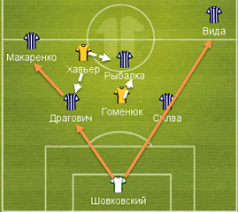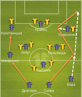 Первый – отыгрыш мяча через Шовковского (см. схему выше). Основная его идея – оттяжка прессингующих игроков соперника в центр и быстрая доставка мяча на фланги. Следует отметить, что на левый фланг мяч чаще доставлялся горизонтально по магистрали через Драговича, который при приеме паса от вратаря уверенно ставил корпус. При доставке мяча на правый фланг чаще следовали вертикали. Это было обусловлено успешными действиями на верховых мячах со стороны Виды.
