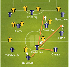 Важной была и вариативность при выходе в атаку через Рыбалку. Опорный киевлян имел как минимум три варианта для передач. Первый – заброс или сквозной пас под рывок Бельханда за спину опорному, второй – пас на ход Виде, третий – отыгрыш назад на Драговича или поперек на Силву. Последний вариант чаще всего использовался в том случае, если Рыбалка не успевал быстро принять решение и его плотно прессинговали соперники.