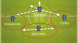 В оборонительной фазе киевляне также задействовали несколько интересных приемов кроме стандартной схемы обороны с уплотнением пространства и линией из четырех игроков. При срыве быстрых атак соперника гости периодически выстраивались в центре ромбом (см. схему выше), фактически играя с последним защитником (в данном случае – Драговичем). Основная идея этого приема была в «торможении» атак соперника посредством индивидуальных действий опорного, Макаренко или Силвы, или же их кооперации для совместного выпада в отбор в полуфлангах. В позиционной обороне несколько раз просматривался переход Динамо на игру с пятью защитниками, практически в линию.