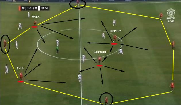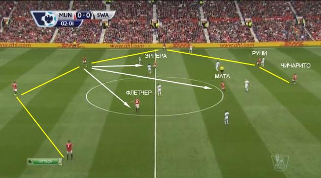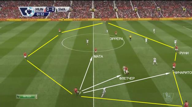 Мяч на правом фланге у Джонса. Фланговые игроки остаются неподвижными, для поддержания ширины атаки. Руни и Чичарито поддерживая глубину атаки, смещаются ближе к мячу. Флетчер, Мата и Эррера тоже смещаются для поддержки атаки к правому флангу.