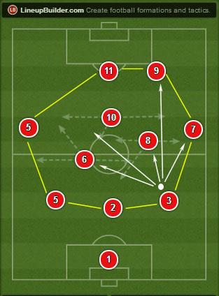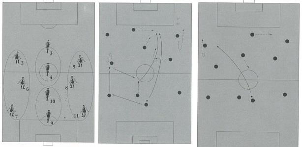 Схематически идею перемещения мяча можно представать следующим образом. Например, если мяч находится у крайнего центрального защитника, для поддержки атаки в его сторону смещается три полузащитника (№6, №8, №10), а также два нападающих (№11 и №9). В игре это выглядит следующим образом.
