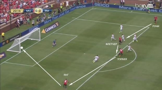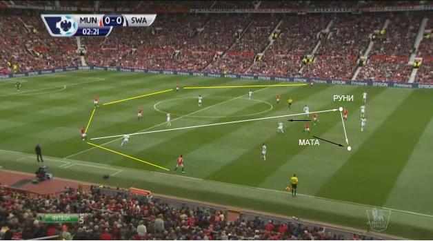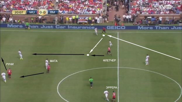 Из линии защиты мяч последовал на фланг. Затем следует быстрая передача в свободную зону на ход Флетчеру. Руни начинает открываться ближе к боковой линии, одновременно освобождая зону для Маты и…