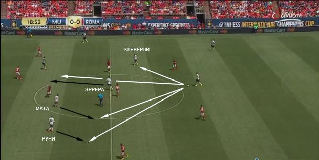 Выше показан снимок из матча против Ромы, на котором можно увидеть типовое взаимное перемещение двух полузащитников МЮ. Обычно, если Мата смещается ближе к защитникам для приема мяча, вперед начинает движение один из центральных полузащитников. В данном случае это Эррера. Таким образом, создается два варианта для развития атаки с помощью средних передач. Если защитник решит выполнить длинную передачу на форварда, тогда выдвигающейся из глубины полузащитник сможет оказать ему поддержку. Похожая комбинация с участием Руни и Маты разбиралась выше.