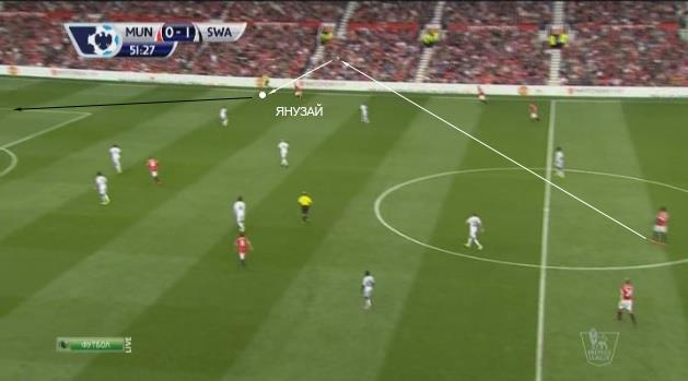 И нужно сказать, идея ван Гаала сработала. В одном из эпизодов, который приведен выше, мяч после длинной передачи был доставлен на правый фланг. Для Янузая была создана ситуация 1 в 1 на фланге, из которой он благодаря своим индивидуальным действиям сумел заработать угловой, после которого Руни сравнял счет в матче.