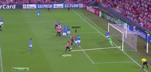 Адурис еще до подачи избавился от опеки Маджо, которого очень грамотно заблокировал Гурпеги, из-за чего итальянский игрок не смог помешать форварду басков прицельно пробить по воротам..