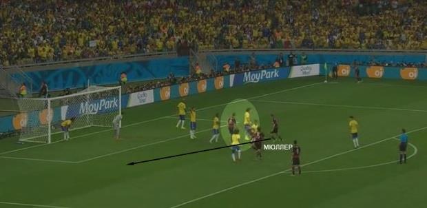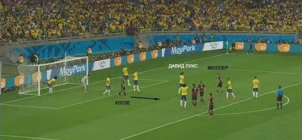 Похожий прием с заслоном можно было увидеть на чемпионате мира в матче сборной Германии против Бразилии. На стандартах Давид Луис персонально играл против Мюллера. Обратите внимание на движение Клозе.