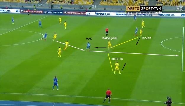 Таким образом, Кучер и Шевчук должны были закрыть зону за спиной Ракицкого. Хотя на снимке видно, что Кучер играл со своим игроком, что может служить оправданием, а вот Шевчук, по всей видимости, должен был оставить своего игрока на фланге и закрыть более опасную зону перед воротами. На самом деле он сделал это, что хорошо видно на повторе, но сделал с опозданием.