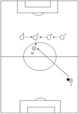 На рисунке показано, что защитник №3, ближний к игроку соперника №10, выдвигается вперед и старается либо перехватить мяч, либо вступить в борьбу за него в момент приема. Защитники №2, №4, №5 сдвигаются так, чтобы закрыть, покинутую защитником №3, зону в обороне.