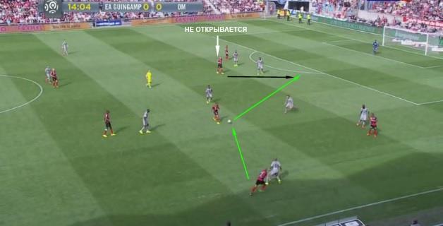 В одной из контратак в оборонительном построении Марселя возник дисбаланс, который игроки Генгама не смогли использовать для перевода атаки на завершающую стадию. Зелеными стрелками показано возможное перемещение мяча. Разыграть типовую комбинацию на третьего игрока не удалось из-за того, что нападающий не открывался, а как можно заметить, ему сейчас есть куда бежать для получения передачи, но своевременный рывок в зону не последовал. Правда, это мало что меняет, просто потому, что игрок, на которого последовала первая передача, не смог обработать мяч. Этот пример хорошо иллюстрирует, как технические и тактические ошибки негативным образом влияют на игру команды в ключевых моментах матча.