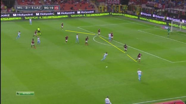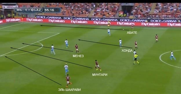 Еще до своего назначения на пост главного тренера Милана Филиппо Индзаги не скрывал, что ему импонирует схема 4-3-3 с быстрыми вингерами. Уже на первых минутах в матче против Лацио можно было удостовериться в том, что может дать скорость на флангах. Стремительный рейд Эль Шаарави увенчался результативной передачей на Хонду. Второй гол был забит также после быстрой атаки с подключением крайнего защитника и врыванием в штрафную вместе с тремя форвардами полузащитника. Именно после такого розыгрыша забил Мунтари.