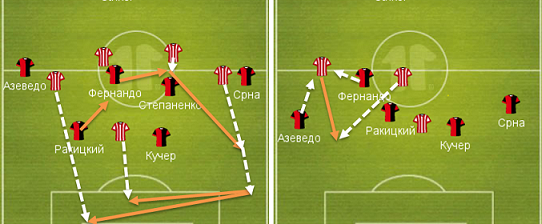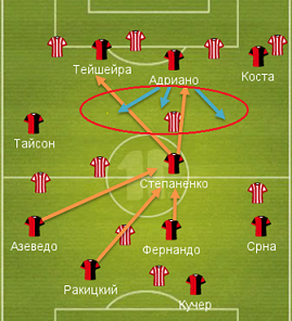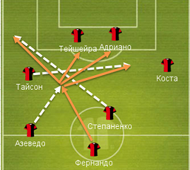 Вышеописанная тенденция подтверждалась и при быстром розыгрыше мяча по центру. Степаненко, получив мяч от партнеров из линии обороны или Фернандо, после ускорения выполнял пас и выключался из игры. В подобных атаках большая часть передач Тараса шла на Адриано и Тейшейру. При этом оба игрока мало того, что были вынуждены принимать мячи не на ход, а в пол-оборота, так еще и не имели вариантов отыгрыша назад (выше на рисунке обозначена «пустая» зона подбора/сброса). Тайсон и Коста могли бы нивелировать этот недостаток. Но левый вингер чаще всего оставался на бровке, а правый – выполнял забегания в зону между Ляпортом и Баленсиагой. Сам же Степаненко, как было сказано выше, после выполнения паса прекращал участие в атаке и не мог обеспечить перекрытие зоны сброса/подбора под Адриано.