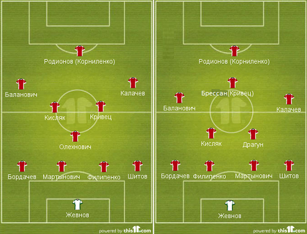 В сравнении с последним матчем в составе у белорусов вероятны изменения. В воротах Гутора сменит Жевнов. И это будет откровенной удачей, учитывая множественные ошибки на выходах Гутора в первом матче отбора далеко не с самым сильным соперником. На левом фланге защиты в отсутствие Веретило вероятно сыграет Бордачев. Если выздоровеет Родионов, то он, а не медлительный Корниленко, сыграет в линии атаки вместо Драгуна. При переходе на 4-2-3-1 связку опорных наверняка сформируют Олехнович (Кисляк) и Драгун, а под форвардом сыграет Брессан или Кривец. В случае отсутствия Родионова в схеме 4-2-3-1 в опорной зоне связку могут составить Олехнович и Кисляк, а форварда сыграет Драгун (Корниленко).