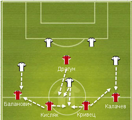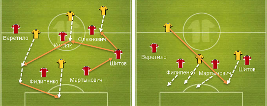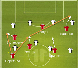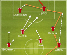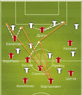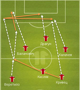 Возможно ускорение игры вертикальными передачами после короткого розыгрыша на границах 1-й и 2-й четвертей поля между защитниками. В таком случае передача будет направлена в пространство между линий обороны соперника на одного из полузащитников, либо к бровке на крайнего форварда. Примеры подобных комбинаций с передачами на Балановича и Кисляка в матче с Люксембургом указаны на рисунке выше.