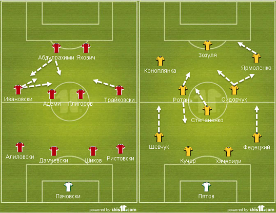 Предполагалось, что наши соперники учтут опыт Беларуси и применят в отчетной игре схему с тремя центральными защитниками. Однако вышло иначе. Гости избрали более гибкую формацию 4-4-2. В атакующей фазе команда Джуровски неоднократно использовала смену позиций и ролей между вингерами и форвардами. Трайковски и Ивановски только номинально были закреплены на правом и левом флангах полузащиты. Оба игрока по ходу игры меняли позиции и фланги. Периодически команда использовала в оттяжке на бровке одного из форвардов (чаще – Абдулрахими). При этом один из вингеров не занимал позицию на уровне с Яховичем, а действовал в зоне под ним. Таким образом расположение команды перекраивалось с 4-4-2 на ассиметричные 4-2-3-1.