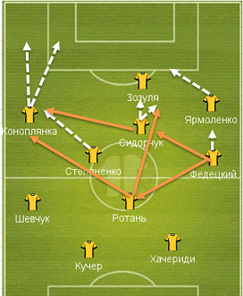 В позиционных атаках наша команда старалась проходить оборону соперника через фланги. В этом был свой резон. Слева ускорение атакам придавал Коноплянка. При отыгрышах соперников и выходе из-под прессинга Евгений удачно использовал свою высокую стартовую скорость и умение обыграть оппонента 1 в 1 на ограниченном пространстве. Справа Ярмоленко и Федецкий старались действовать в более комбинационной манере. Оба игрока также не гнушались силовой борьбы и часто прибегали к укрыванию мяча корпусом.