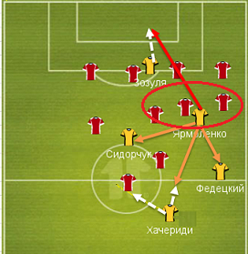 Наша команда старалась строить свои атаки постепенно (схемы далее перечисленных перестроений указаны на Рисунке выше). При розыгрыше атак тройка полузащитников постоянно находилась в движении. Ротань менялся позициями со Степаненко. При этом смена ролей не происходила. Поэтому в подобных эпизодах Ротань играл роль оттянутого плеймейкера аля Пирло. Степаненко несколько раз пытался сдваивать фланг с Коноплянкой и делал диагональные забегания к левой бровке (подобное он периодически практикует в Шахтере). Сидорчук чаще играл по центру, создавая глубину атаки под Зозулей, и лишь изредка смещался к правой бровке. Это объяснялось активными действиями на правом фланге связки Федецкий – Ярмоленко. Последнего плотно опекали соперники, которые похоже очень боялись успешных открываний Андрея у них за спинами. При получении мяча Ярмоленко на углу штрафной соперника или в зоне правого инсайда перед ним сразу «вырастали» 2-3 соперника, а в целом в зоне мяча находилось 5 игроков сборной Македонии (пример на Рисунке ниже). Это практически сводило на нет возможность для Андрея обострять игру проникающими передачами на Зозулю.