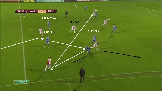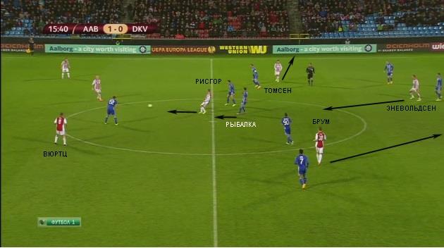По ходу матча Рыбалке довольно часто приходилось играть против Рисгора. Выше на снимке можно увидеть, как Сергей уходит из своей зоны за атакующим полузащитником датчан, после чего противник моментально использует это для перевода атаки в следующую стадию. Обратите внимание на синхронные взаимные перемещения Томсена, Эневольдсена и Брума. Томсен уходит на фланг, тем самым еще сильнее расширяя пространство в центре, Брум открывается под длинную передачу в линию нападения, а Эневольдсен занимает открытое пространство позади Рыбалки.