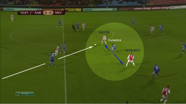 А на этом снимке показано уже развитие голевой атаки Ольборга. Теперь Хелениус опускается в линию полузащиты, тем самым создавая ситуацию 2 в 1 против Рыбалки.