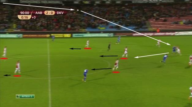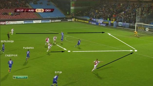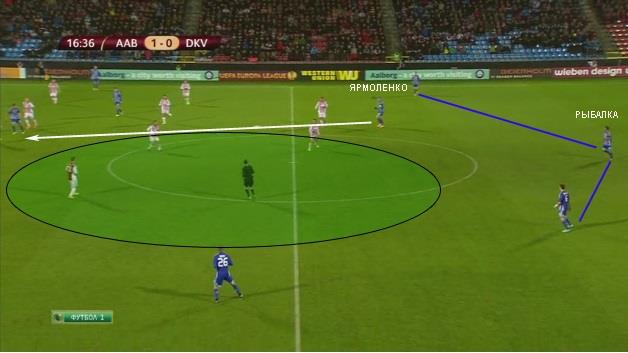 Во время атаки игровая схема Динамо трансформируется из 4-3-3 (или, скорее, из 4-1-4-1) в 3-4-3: опорный полузащитник опускается в линию обороны, а крайние защитники смещаются в линию полузащиты. Как видим, на схеме Рыбалка расположен на позиции центрального защитника, Ярмоленко опускается ниже, получает мяч и выполняет обостряющую передачу через опорную зону противника, где сконцентрировано много игроков Ольборга.