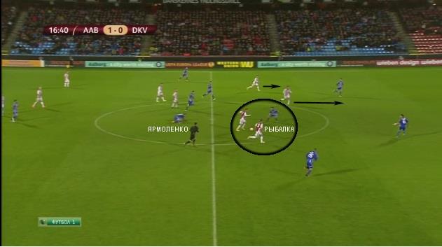 Ярмоленко безуспешно попытался самостоятельно исправить ситуацию. Из-за разрыва между линиями, что вновь привело к провалу в опорной зоне, противник вновь создал ситуацию 2 в 1 против Рыбалки в центре.