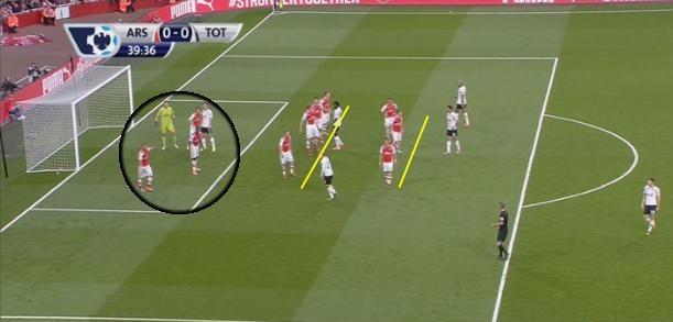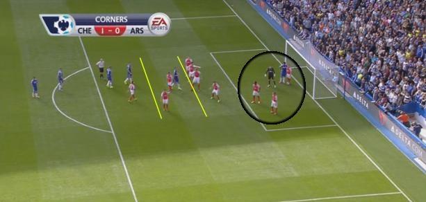 На данном снимке показано один из возможных методов обороны во время угловых, при котором не используется персональная опека. Именно так защищается лондонский Арсенал. Идея Венгера заключается в следующем: