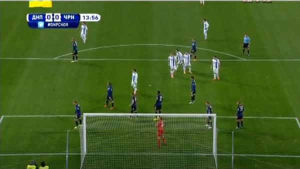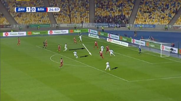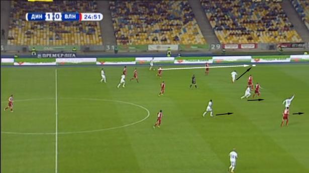 Матч Динамо – Волынь. Ленс использует разрыв между крайним и центральным защитником соперника, открываясь по диагонали для приема передачи на фланге. Обратите внимание, что, как только передача проходит, вся линия обороны разворачивается и вынуждена бежать лицом к своим воротам.