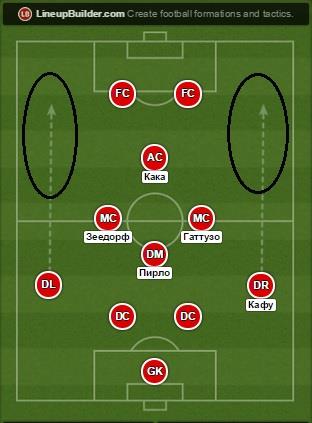 Еще можно вспомнить построение Милана Карло Анчелотти 4-4-2 в виде ромба. Пирло действовал на привычной для себя позиции опорного полузащитника, чуть выше располагались Зеедорф (слева) и Гаттузо (справа). Если Кларенс вместе с Кака был одним из главных вдохновителей атак Милана, то Дженаро в большей степени был ориентирован на разрушение и располагался ближе к правому флангу, на котором действовал Кафу. Бразилец смело шел вперед, оставляя свою зону на фланге под просмотром Гаттузо.