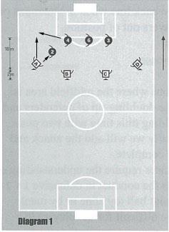 На данной схеме показано, как, согласно теории, должна выполняться взаимная подстраховка, если противник пытается прорваться к воротам через зону крайнего защитника. В идеале два центральных защитника и дальний крайний должны смещаться к зоне игровых действий и втроем располагаться перед штрафной. На практике зачастую так и происходит, но между тем у атакующей команды довольно часто возникают возможности реализовать идею, которая показана на схеме ниже.