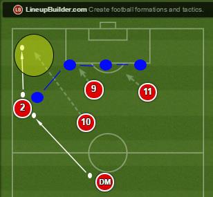 В общем, идея смещений полузащитников в середину с целью расширений зон действия крайних защитников давно известна и с успехом реализуется в наше время. Мы же рассмотрим еще одно взаимодействие, которое также с успехом применяется на практике.