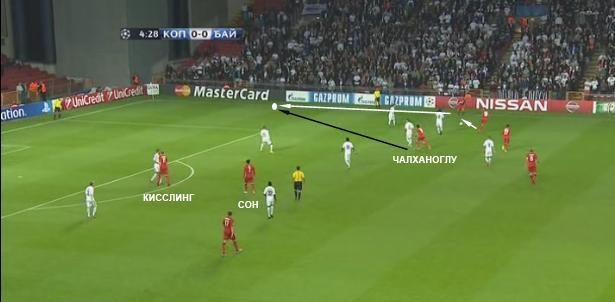 Вновь, после того как Чалханоглу получил мяч на фланге, защитники Копенгагена вынуждены бежать на свои ворота, одновременно упуская из виду Сона и Кисcлинга, которые на скорости врываются в штрафную. Просматривая видео с эпизодами, обратите внимание, как данный розыгрыш позволять моментально взвинтить темп и увеличить скорость игровых действий.