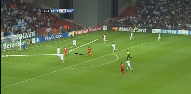 Второй эпизод взят из матча Копенгаген – Байер. Признаться, команда Роджера Шмидта производит очень приятное впечатление. Определенно, если у игроков Байера получается реализовать атакующие идеи своего наставника, то матч смотрится на одном дыхании, так как динамичная игра команды Шмидта постоянно держит в напряжении и прекрасно позволят прочувствовать энергетику упорной схватки на футбольном поле.