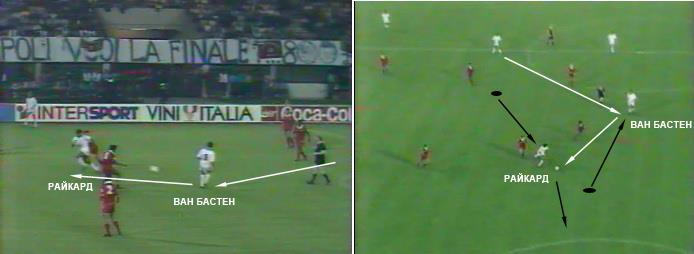 Выше показаны снимки из двух камер. Черными стрелками показаны взаимные перемещения Райкарда и ван Бастена, а белыми движение мяча. Как видим, задумка Сакки сработала. Ван Бастен раскрыл пространство перед воротами, а Райкард использовал открывшуюся зону для выхода на ударную позицию.