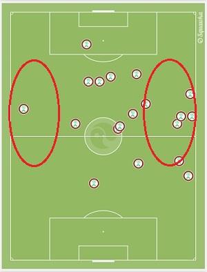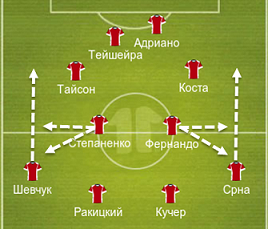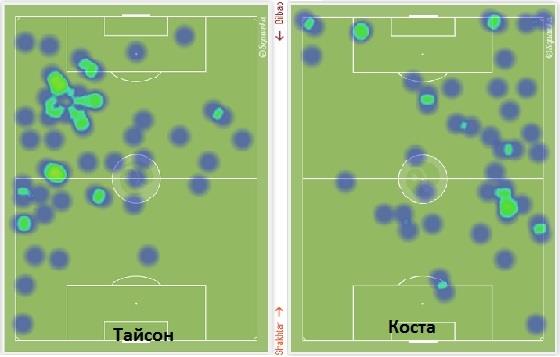 Значительную роль в атаках Шахтера играл Тайсон (33 принятых паса, 37 отданных). Левый полузащитник действовал очень вариативно. Он чередовал комбинации на фланге с Шевчуком со смещениями в центр поля. Коста также старался действовать в подобном ключе (зоны действий игроков отображены на рисунке выше), но был менее активен в комбинационных действиях (29 принятых пасов; 22 отданных). Смещения одного из вингеров в центр позволяло команде заполнять пространство в зоне между опорными и выдвинутыми вперед Тейшейрой и Адриано. Лучше с этой ролью справлялся Тайсон. Согласно данным uefa.com, он гораздо успешнее связывал игру и выполнял доставку мяча партнерам (95% точных передач против 82% у Косты). Следует отметить и то, что Тайсон чаще пасовал мяч в линию атаки. На его счету 6 точных передач на Тейшейру и Адриано, против 2 у Косты.
