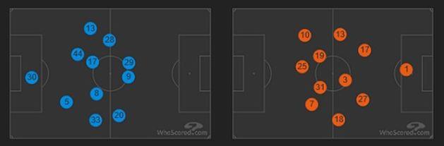Оба тренера использовали разные формации. Выбор Луческу пал на 4-2-3-1, а Гвардиолы — на 4-3-3. В отсутствие в стартовом составе Левандовски баварцы предпочитали играть горизонтально, практически не применяя вертикалей вперед. Подвижная группа атаки обеспечивала гостям вариативное проникновение на чужую половину, однако в целом общая геометрия игры соответствовала канонам 4-3-3. Это подвергают и усредненные позиции игроков Баварии, которые показаны оранжевым цветом на рисунке ниже.