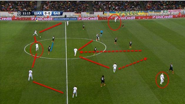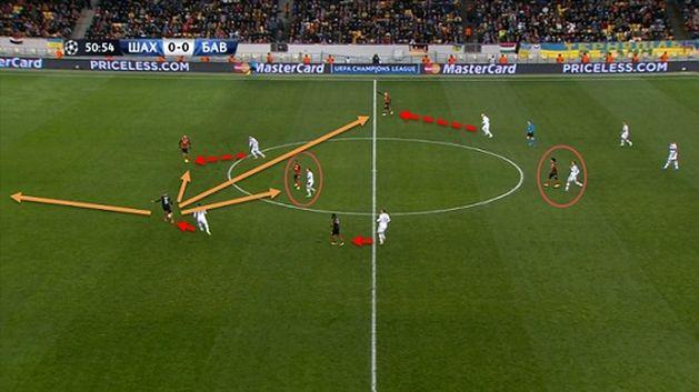 При быстром выходе из обороны хозяевам не доставало вариативности: Адриано постоянно был перекрыт двумя игроками соперника. При этом защитники Баварии вовсе не концентрировались на плотной опеке, а скорее находились на небольшом расстоянии за спиной или сбоку от Адриано и наблюдали за его действиями. Такая манера игры позволяла им быстро сократить дистанцию с форвардом Шахтера, а также вступить в отбор неожиданно для соперника. Подбор до удаления старался обеспечивать Алонсо. Таким образом нивелировалась связка Адриано и Тейшейры, а вертикальный выход из обороны через форварда терял для Шахтера смысл. Как следствие этого Адриано провел всего 4 верховых дуэли за матч (данные whoscored.com). Розыгрыш контратак низом через Косту или Тайсона был менее опасен для баварцев, так как они неплохо контролировали перемещения вингеров Шахтера, не позволяя им иметь варианты для развития атак скоростным ведением через свободное пространство.