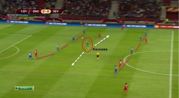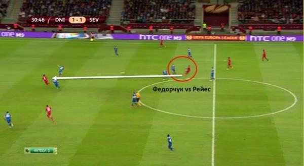 В отличие от Канкавы, Федорчук и Ротань не всегда эффективно обеспечивали сдерживание соперника в центральной зоне. Если Канкава выиграл 67% борьбы в обороне, то Федорчук – 55%, а Ротань – всего 29%. Вторая голевая атака Севильи началась именно после неудачной попытки Федорчука навязать борьбу сопернику. Это в сочетании с неудачной игрой по сопернику Дугласа стоило днепрянам пропущенного мяча.