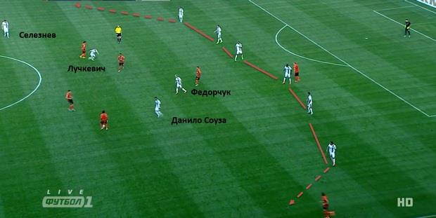 При сдерживании соперника за счет игры Федорчука, Лучкевича и Данило Соузы линия обороны могла насыщаться за счет включения в нее двух дополнительных игроков (см. скриншот выше). Таким образом выдерживалась высокая горизонтальная компактность, а Шахтер не имел возможностей ускорить игру диагональю к бровке.