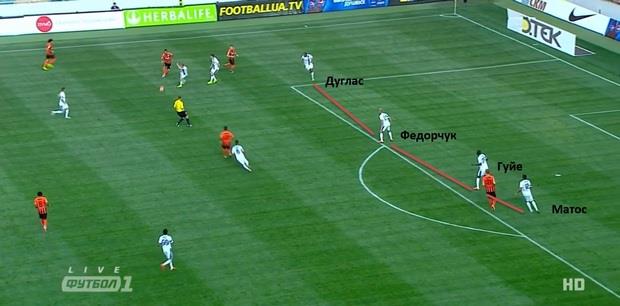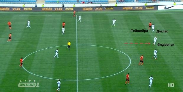 Федорчук в роли центрального защитника часто играл до конца эпизода. Поэтому после окончания опеки Тейшеры Дуглас мог незначительное время играть номинального правого защитника. Такие действия опять же позволяли Днепру задействовать в агрессивной роли Федецкого, который часто выходил на соперников вверх по бровке.
