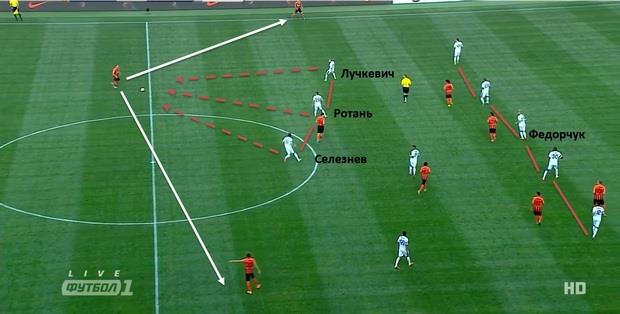При сдерживании соперника другими игроками Федорчук активно смещался назад. Он становился пятым защитником (см. скриншот выше). Движение Федорчука в оборону сопровождалось активным прессингом с участием Селезнева. В подобных эпизодах Селезнев оказывал дополнительную поддержку полузащитникам вместо сместившегося вглубь Федорчука. Селезнев формировал коалиции с Ротанем и Лучкевичем. За счет коллективных действий тройка игроков Днепра лишала возможности соперника для быстрого продвижения атаки через центр. Фактически горнякам оставалось играть через фланги или выполнять поперечный перепас (см. скриншот выше). Попытки сыграть на обострение не были эффективны, так как горняки неудачно выполняли сквозные передачи через 2 линии обороны Днепра.