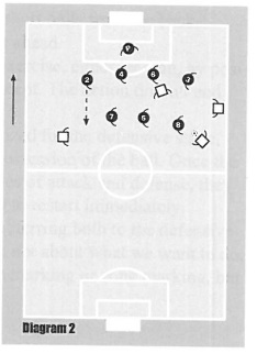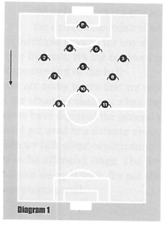 - Конечно. Но, например, если наш правый защитник №2 не имеет в своей зоне игрока для опеки, то он может выдвинуться выше в линию полузащиты (Diagram2). В целом же применяется зонный метод обороны: если фланговый полузащитник противника находится ближе к центральной оси поля, то он контролируется нашим полузащитником. Если же он смещается ближе к нашим воротам, то он попадает в зону ответственности нашего защитника.