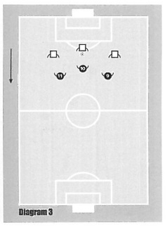 - Он должен постоянно оказывать прессинг на оборону противника. Если соперник играет с тремя защитниками (Diagram3), то наш атакующий полузащитник должен атаковать центрального защитника, в то время как наши два форварда должны начать прессинговать остальных двух защитников, тем самым мешая строить сопернику атаку еще на начальной фазе.