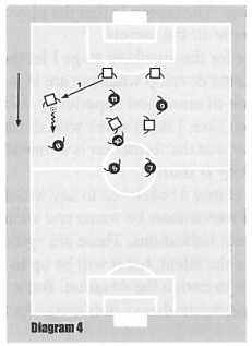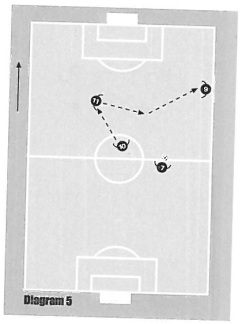 - Фланги должны покрываться с помощью двух крайних защитников, которые должны обладать хорошими атакующими навыками. Эти требование относится также к крайним полузащитникам, которые должны уметь хорошо двигаться на поле, выполняя различные маневры. На (Diagram5)показан один из атакующих маневров: