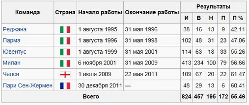 В 2011 году Ачелотти возглавил ПСЖ, с которым продолжает работу и по сегодняшний день. Ниже приводится статистика итальянского специалиста за весь период его тренерской деятельности: