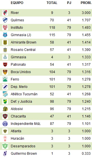 Таблица вылета (ole.com.ar):
